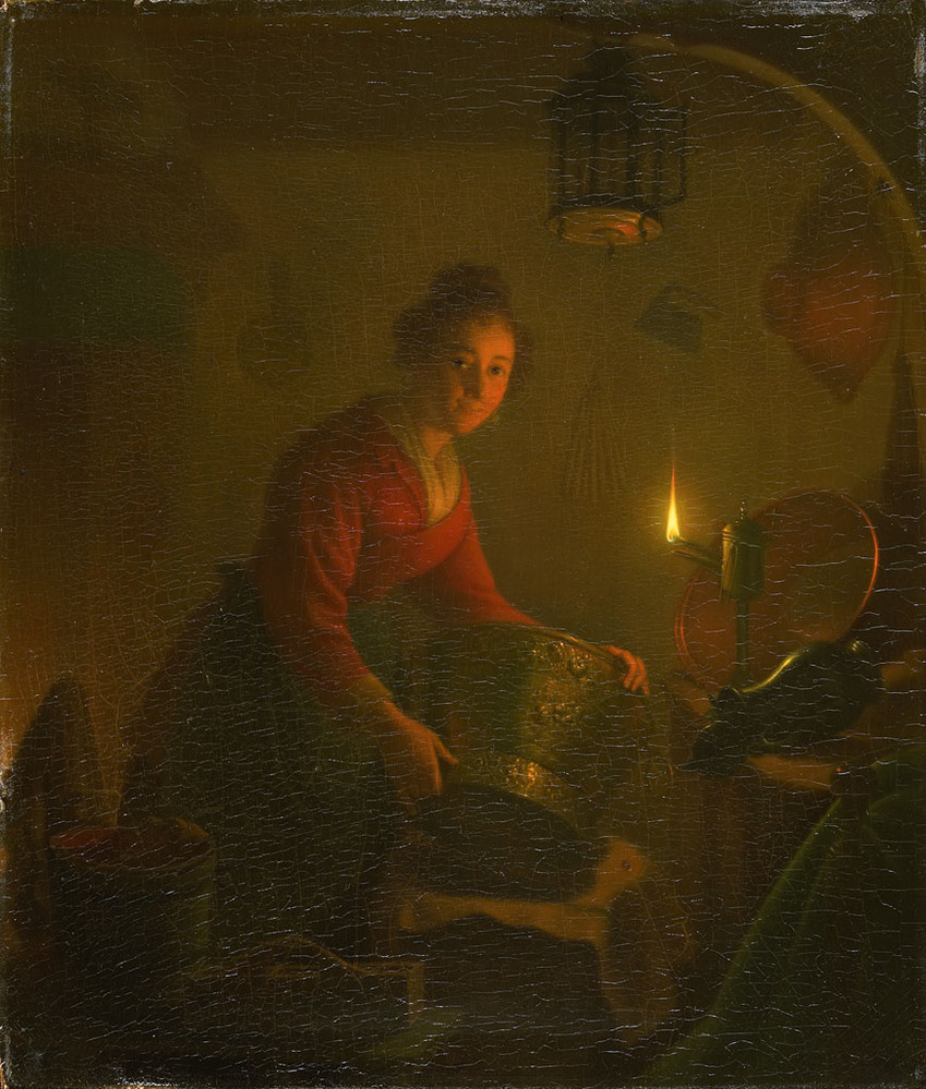 Een vrouw in een keuken bij kaarslicht. Een dienstmeid is bij het licht van een olielampje koperen pannen en ketels aan het schuren