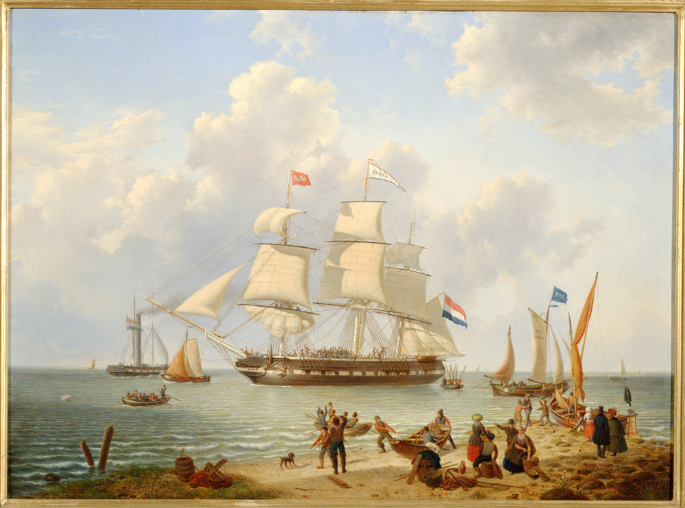 Evenals Schotels schilderij van de Willemssluis spreekt uit deze voorstelling van het koopvaardijschip Flevo vertrouwen in de toekomst. De Flevo was gebouwd in 1836 en voer in de eerste vier jaar van haar bestaan driemaal naar Batavia onder kapitein Hendrik Amsberg. Adriaan van der Hoop kocht het schilderij direct van de kunstenaar in 1837 voor 650 gulden. Volgens de notitie in Van der Hoops kasboek is het schip weergegeven ‘by het uitzeilen van de Haven van het Nieuwe Diep, op het oogenblik dat de Stoomboot Noord-Holland die het schip uitgesleept had, hetzelve verlaten heeft; met ryke stoffagie van schuiten en personen, staande op den hoek tusschen den Helder en Kykduin en een verschiet op het Eiland Texel.’ ( Norbert Middelkoop)