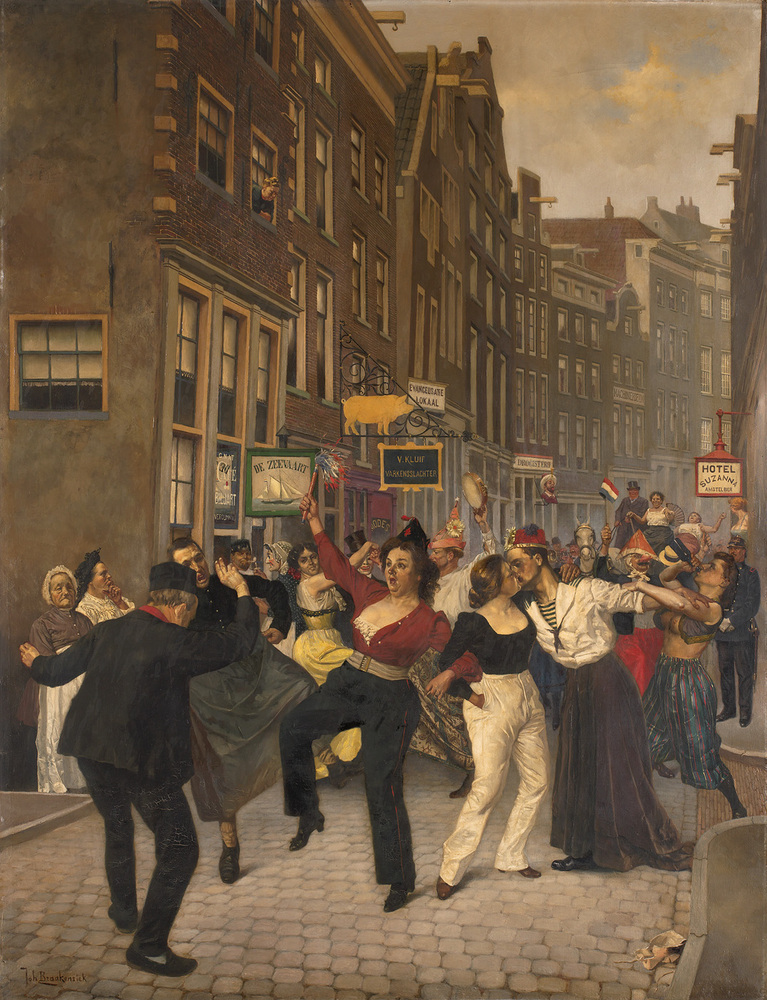 Dit schilderij beeldt Hartjesdag uit zoals dat omstreeks 1900 op de Zeedijk en in de Warmoesstraat zou zijn gevierd. De straat staat nu bekend om de Aziatische invloeden en een concentratie van homokroegen.