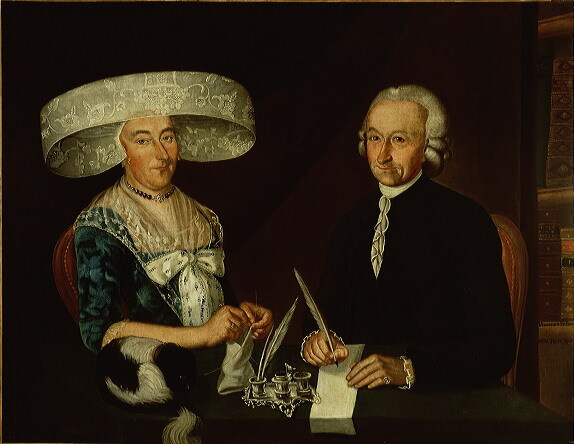 Achter een groene tafel, waarop in het midden een driedelig inktstel met daarnaast een hondje, zit een heer met grijze pruik. Hij is bezig te schrijven. In de rechterhand een ganzenveer in schrijfhouding. Links een dame met een grote ovalen kanten kap (zgn. grote Duitse muts), die zich met een handwerkje bezig houdt.