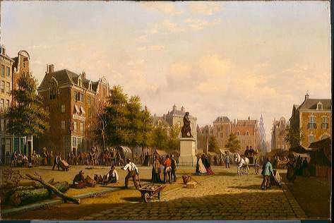 Reguliersplein (thans Thorbeckeplein) in 1869, met op de achtergrond de Botermarkt (thans Rembrandtplein)