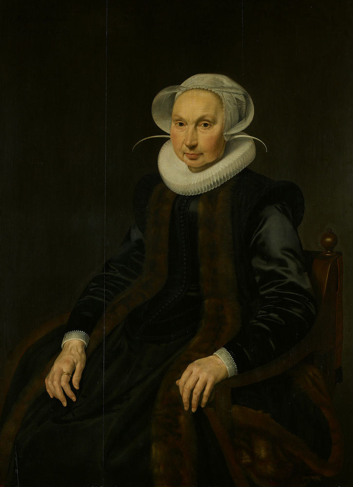 Anna Jacobsdr. Blaeu (overleden in 1627; twee andere portretten vanhaar vermeld bij MOES, nr. 693), huwde in 1578 met de koopman en latere burgemeester Cornelis Pietersz. Hooft (1547-1626). De dichter Pieter Cornelisz. Hooft was hun zoon. Zijzelf was een dochter van Jacob Willemsz. Blaeu, haringkoopman "In de witte voet" bij de Haarlemmerpoort, en een nicht van de bekende kartograaf, drukker en uitgever Willem Jansz Blaeu. In 1591 kocht haar echtgenoot van haar moeder, die inmiddels weduwe was, het huis "In de witte voet", waar het paar daarvoor al was ingetrokken. Na 1600 woonden zij op het Singel (zie: ELIAS I, p. 147, 474; ook over dit echtpaar: J.F.L. de Balbian Verster, Burgemeesters van Amsterdam, Zutphen 1933, p. 3 e.v.).