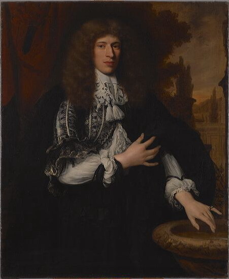 Portret van een staande man tot de knie met op de schouders vallend bruin haar, gekleed in zwarte mantel met kant, de linkerhand voor de borst, de rechter boven een waterbassin, in parkachtig landschap.