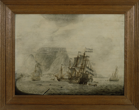 Driemaal per jaar voer een VOC-vloot naar Oost-Indië. De heenreis duurde circa acht maanden en de terugreis, dankzij gunstige winden en stromingen, circa zeven maanden. Naar de Oost nam men gemunt en ongemunt goud en zilver, bouwmaterialen en luxegoederen mee. Terug vervoerde men aanvankelijk specerijen en vanaf de 18e eeuw ook koffie, thee, suiker, zijde, tabak en porselein. Op de lange tochten was het een probleem om aan vers voedsel en water te komen. Daarom richtte de VOC in 1652 aan de voet van de Tafelberg, bij Kaap de Goede Hoop, een verversingsstation op. Dit was het latere Kaapstad. Op het schilderij, rechts van de Oost-Indiëvaarder, zeilt een galjoot, een schip dat vaak diende om berichten over te brengen tussen het vaderland en de Oost.