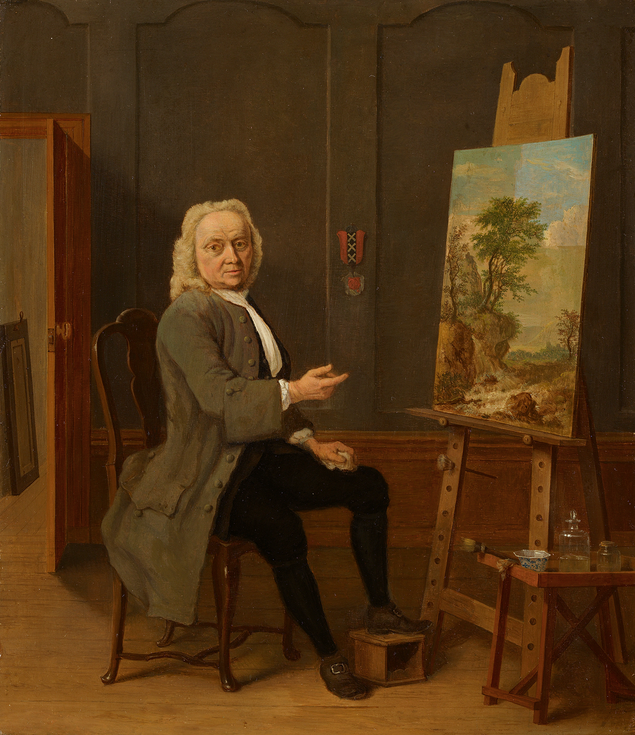 Op dit schilderij uit 1754 zien we de schilderijenrestaurator Jan van Dijk (ca. 1690-1769) die naar een zeventiende-eeuws landschapje op een ezel wijst. Waarschijnlijk heeft hij dit zojuist ontdaan van een vervuilde vernislaag, want de rechterbovenhoek van dit schilderij is aanzienlijk lichter dan de rest van het doek. Op een tafeltje naast de ezel staan zijn hulpmiddelen: niet de typische benodigdheden van een schilder maar het materiaal van een restaurator. De glazen stopfles bevat wellicht een schoonmaakmiddel en het chinees porseleinen kommetje kan gediend hebben voor vernis afkomstig uit het andere potje. Met de brede kwasten kon Van Dijk die aanbrengen op het schilderij. Op de achterwand hangt prominent het wapen van Amsterdam.