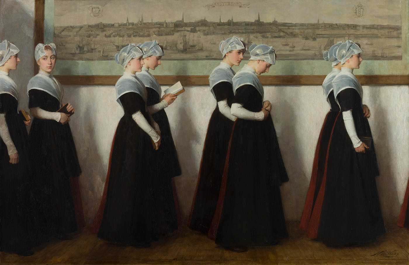 Nicolaas van der Waaij was gefascineerd door tijdloze de uitstraling van de Amsterdamse burgerweesmeisjes. Hij maakte een serie schilderijen en tekeningen van modellen, gekleed in het rood-zwarte kostuum van de burgerwezen. Zijn werk roept een sprookjesachtig beeld op, dat waarschijnlijk niets met de harde werkelijkheid in het weeshuis van doen had. Op dit schilderij is de zondagse kerkgang afgebeeld. Iedere zondag liepen de jongens en meisjes in een lange stoet van het Burgerweeshuis naar de Westerkerk aan de Prinsengracht of naar de Nieuwe Kerk op de Dam. Onderweg ontmoetten zij dan de in blauw-zwart geklede wezen van het weeshuis van de Hervormde Diaconie. De weeskinderen hadden hun eigen plaats in de kerk.