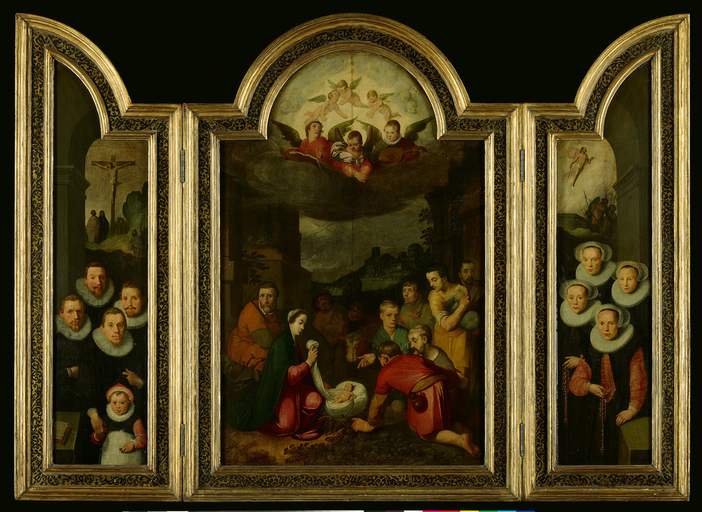 Middenpaneel binnenzijde: op voorgrond links met Jozef met mand met tuingereedschap en Maria voor wieg waarop het kind, rechts zes herders (de tweede van rechts draagt een zak; op repro is volgens de catalogus van 1890 een schaap te zien). Doorkijk tussen Romeinse architectuurdelen op bergland met herders en schapen en links in de lucht een engel. Boven in de ronde kap drie engelen in een wolk, waarvan de middelste een gebaar maakt van iets vast te houden (zie repro catalogus 1890: een naar beneden gespannen touw); Boven deze drie engelen drie andere en langs de rand engelkopjes.