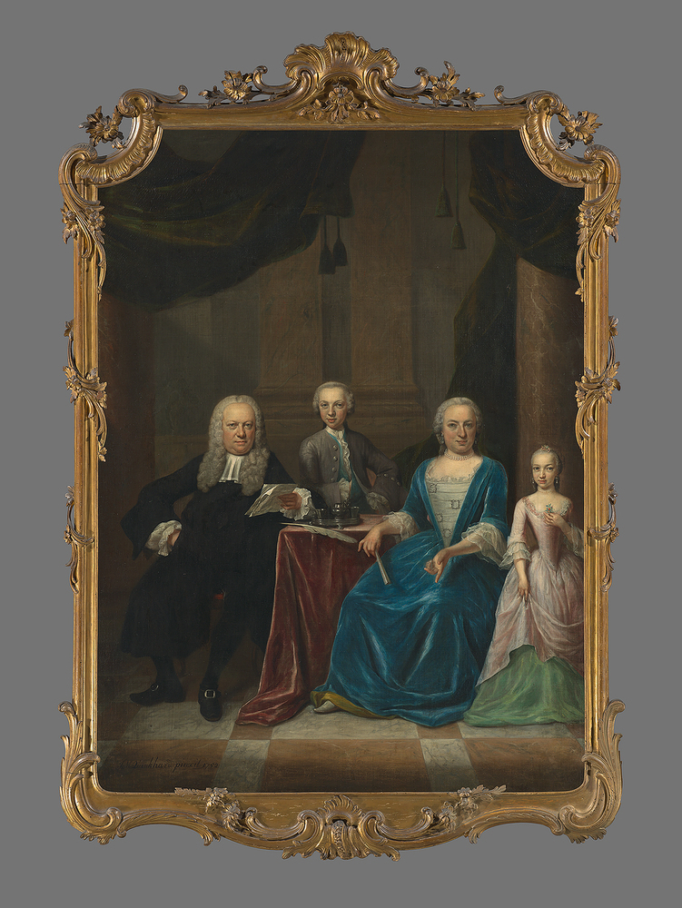 Het gezelschap zit voor een strak classicistische wanddecoratie, links en rechts opgenomen gordijnen. De vader draagt een zwarte toga met witte bef en witte manchetten; gepruikt. De jongen draagt een lichtgrijze jas over een blauw vest, de moeder heeft een groen-blauw kleed aan en het meisje een rose overkleed over een lichtgroene rok. Linksboven het familiewapen van het ouderpaar.