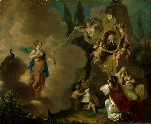 Albertus Titsingh (1714–1790) was een vermaard chirurgijn en vroedmeester. Achter zijn portret is rechts de Sint Bavokerk in Haarlem afgebeeld, waar Titsingh is begraven. Op de epitaaf prijken de wapens van Amsterdam en van die van de familie Titsingh. Engeltjes houden het motto vast van de beroemde medicus Herman Boerhaave (1668–1738). Een treurende zwangere vrouw wordt door de Amsterdamse stedenmaagd ter verzorging voorgedragen aan de godin Juno, de beschermster van huwelijk en geboorte. Andriessen is vooral bekend als schilder van arcadische landschappen, die als kamerbehangsels in de grachtenhuizen werden gebruikt