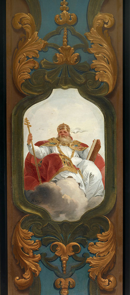 Op de afgebeelde plafondschildering zien we een rijk geklede kerkelijk leider met staf en mijter op een wolk gezeten. Naast zijn linkeroor vliegt een witte duif, symbool voor de Heilige Geest, die Gregorius zou hebben geïnspireerd bij het schrijven van zijn boeken. Het is één van zes doeken van zgn. ‘Kerkvaders’ en ‘Kerkleraren’, die Jacob de Wit in 1729 vervaardigde voor de pastoriebibliotheek van de kerk van Sint-Antonius van Padua – in de volksmond beter bekend als de Mozes en Aäronkerk –, gelegen tussen de Jodenbreestraat en het Waterlooplein. ( Maarten Jansen)