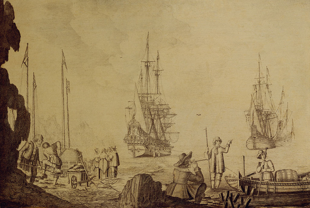 Rechts zijn twee fluitschepen afgebeeld, links een behoorlijk bewapend spiegelschip met 24 stukken geschut. Voorts zijn rechts een scheepsboot en links een paar bijboten te zien; de laatste zijn te herkennen aan de Hollandse tuigage met korte gaffels. De mannen links op de voorgrond steken zout van de zoutpannen, op de kruiwagen ernaast liggen grote plakken zout. Het ruwe zout werd gehaald uit Spanje, Portugal, de Kaap Verdische eilanden en van Curaçao, Bonaire en St. Maarten. Wellicht is de zoutwinning op één van deze eilanden afgebeeld. Zout was onontbeerlijk voor het conserveren van vlees, vis en groente. In Amsterdam werd het ruwe zeezout opgeslagen en verwerkt in de zoutketen tegenover het Realeneiland.