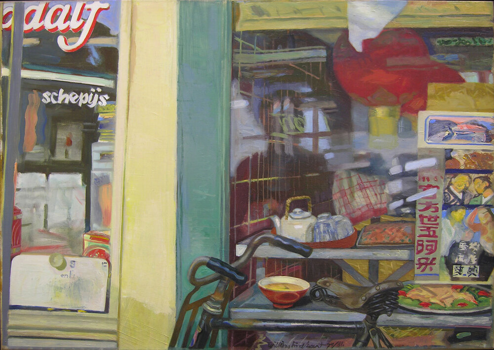 Op het schilderij Etalage van het Chinees-Indisch Restaurant Kar Ho, Zeedijk 67 zijn alle voorwerpen in de etalage te zien én de weerschijn van de kunstenaar die een foto maakt. Voordat Lindhout aan de schilderijen begon fotografeerde hij de buurt. ( Annemarie de Wildt)