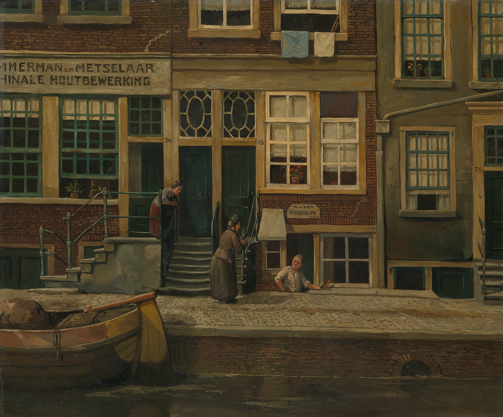 Wij zien een stukje bebouwing langs de Lijnbaansgracht, vlakbij de oude stadsmuren in de Jordaan. De gracht dankt zijn naam aan de lijnbanen van touwslagerijen die daar ooit aan gevestigd waren. De mensen op dit schilderij, ter hoogte van de Lijnbaansgracht 74-76, zullen de stadsmuur al niet meer kennen. Zij wonen gestapeld boven elkaar. Onderin wonen de armsten in vochtige kelders. Wie nog minder geld heeft woont op een achtererf. Het is normaal dat hele gezinnen samenhokken in één ruimte. ( Sarah Remmerts de Vries)