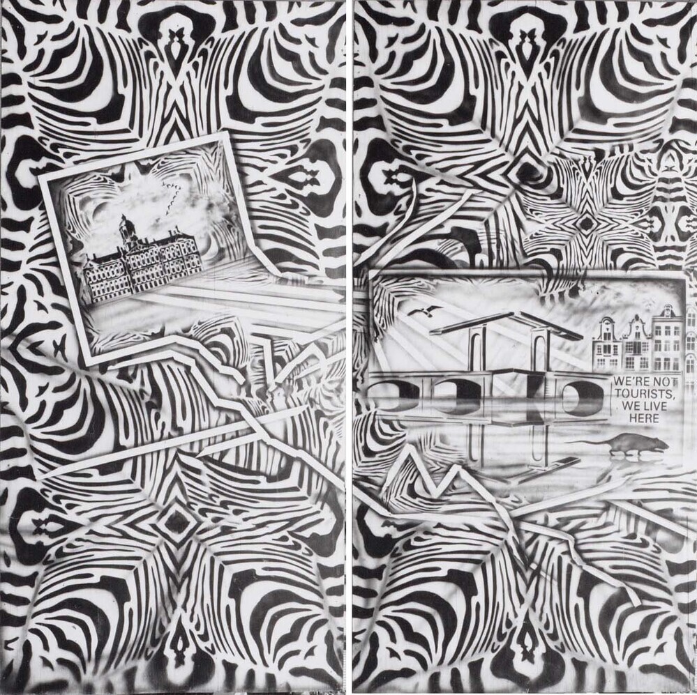 Rondom een bouwput op het Waterlooplein was in 1983 een zestig meter lange schutting geplaatst. Deze werd daarna geheel beschilderd door graffitikunstenaar Hugo Kaagman. Met behulp van sjablonen verwerkte hij politieke en sociale onderwerpen in collages. Amsterdamse motieven worden afgewisseld met Arabische en zebrapatronen. Toen de schutting overbodig was, zijn de panelen met afbeeldingen van het Paleis op de Dam en de Magere Brug aangekocht door het museum. ( Norbert Middelkoop)