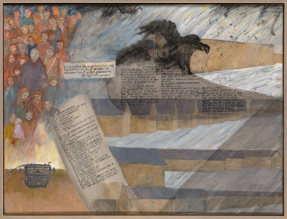 Clara de Jong schildert hier in zestien delen het vreselijke lot van de joodse bevolking van Amsterdam tijdens de Tweede Wereldoorlog (1940-1945). Het eerste schilderij start in de stad, met de antisemitische maatregelen die door de bezetter genomen worden. Vervolgens wordt de toeschouwer chronologisch meegenomen langs razzia’s, segregatie, de Hollandsche Schouwburg en de deportatie naar concentratiekampen. Elk schilderij bevat een of meerdere zwarte raafachtige figuren, die als brengers van onheil over de voorstelling waken. Op het laatste paneel is slechts een lange lijst namen van gedeporteerden weergegeven, oplossend in een zwarte wolk. ( Sarah Remmerts de Vries)
