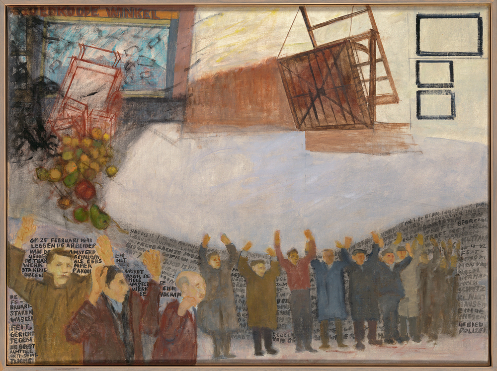 Clara de Jong schildert hier in zestien delen het vreselijke lot van de joodse bevolking van Amsterdam tijdens de Tweede Wereldoorlog (1940-1945). Het eerste schilderij start in de stad, met de antisemitische maatregelen die door de bezetter genomen worden. Vervolgens wordt de toeschouwer chronologisch meegenomen langs razzia’s, segregatie, de Hollandsche Schouwburg en de deportatie naar concentratiekampen. Elk schilderij bevat een of meerdere zwarte raafachtige figuren, die als brengers van onheil over de voorstelling waken. Op het laatste paneel is slechts een lange lijst namen van gedeporteerden weergegeven, oplossend in een zwarte wolk. ( Sarah Remmerts de Vries)