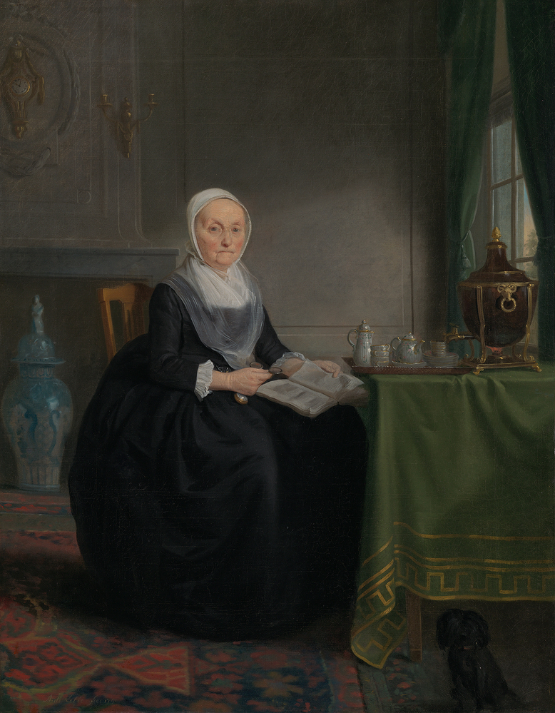 Adriaan de Lelie portretteerde Geertje Hagen in 1791 aan het begin van de theeceremonie: op het dienblad staat een servies van Europees porselein en het water in de neoclassicistische theevaas is aan de kook gebracht. Het is zomer, want in de schouw is een grote siervaas geplaatst. Of het voorgestelde Louis XVI-interieur de werkelijke situatie weergeeft, kan niet langer worden vastgesteld.
