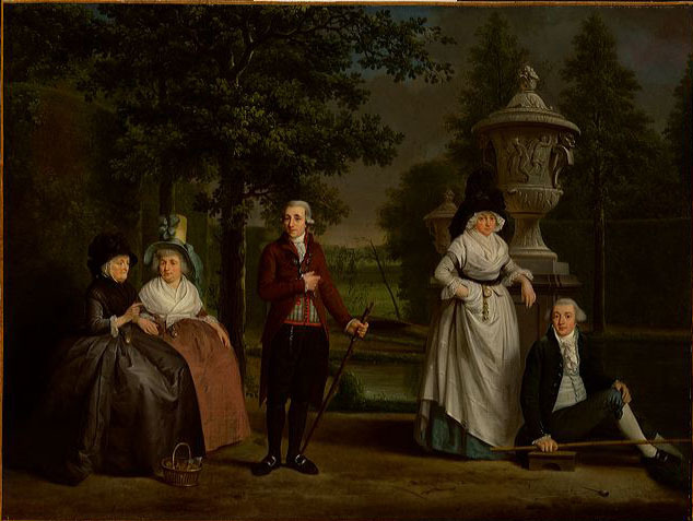 Vele welgestelde Amsterdammers hielden er een buitenplaats op na. Bevrijd van stedelijke beslommeringen kon men er ‘en famille’ van het landleven genieten. In 1787 kocht de kassierder Isaac Lodewijks Jr. (1744–1809) de buitenplaats Rijgersdaal aan de Amstelveense weg. Hij liet zich door De Lelie portretteren temidden van zijn familie: links zitten zijn moeder Geertje Hagen en zijn zuster Cecilia, rechts zijn zuster Geertje en haar zoon Abraham de Haas. Lodewijks bleef ongehuwd. Moeder Geertje is ook afgebeeld op het portret links van de vitrine. De landelijke omgeving suggereert dat De Lelie zijn groepsportret op Rijgersdaal heeft gesitueerd. De monumentale tuinvazen zijn nauw verwant aan het werk van Jan Pieter van Baurscheit (1669–1728) maar het is niet bekend of Lodewijks dergelijke vazen bezat.