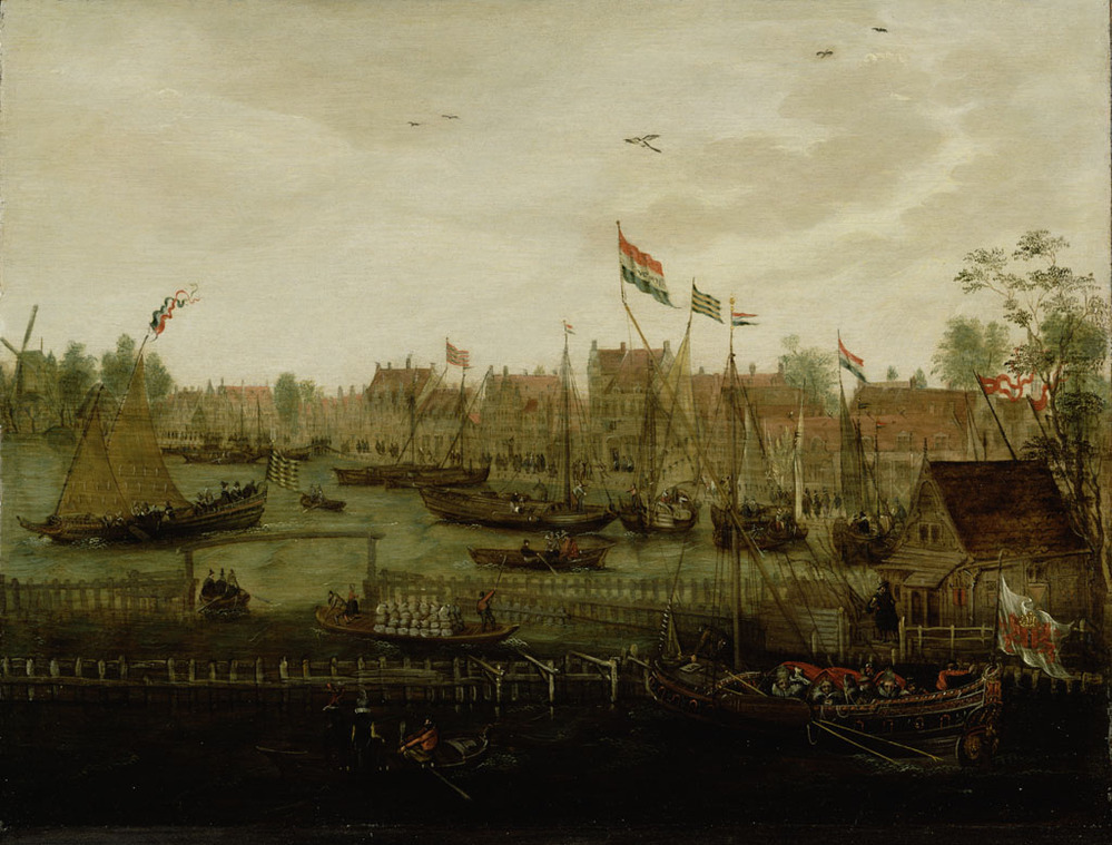 Op voorgrond is een palenrij zichtbaar. Rechts een huisje, van waaruit een stedelijke functionaris bij het luiden van de avondklok een boom over het water moest leggen om de scheepvaart voor de nacht stil te leggen. Opvallend is het schip met het Amsterdamse stadswapen. Het is niet bekend of dit een officieel stedelijk jacht is. Voorts is links een, voor die tijd, modern vaartuig afgebeeld, met aan beide masten driehoekige zeilen.