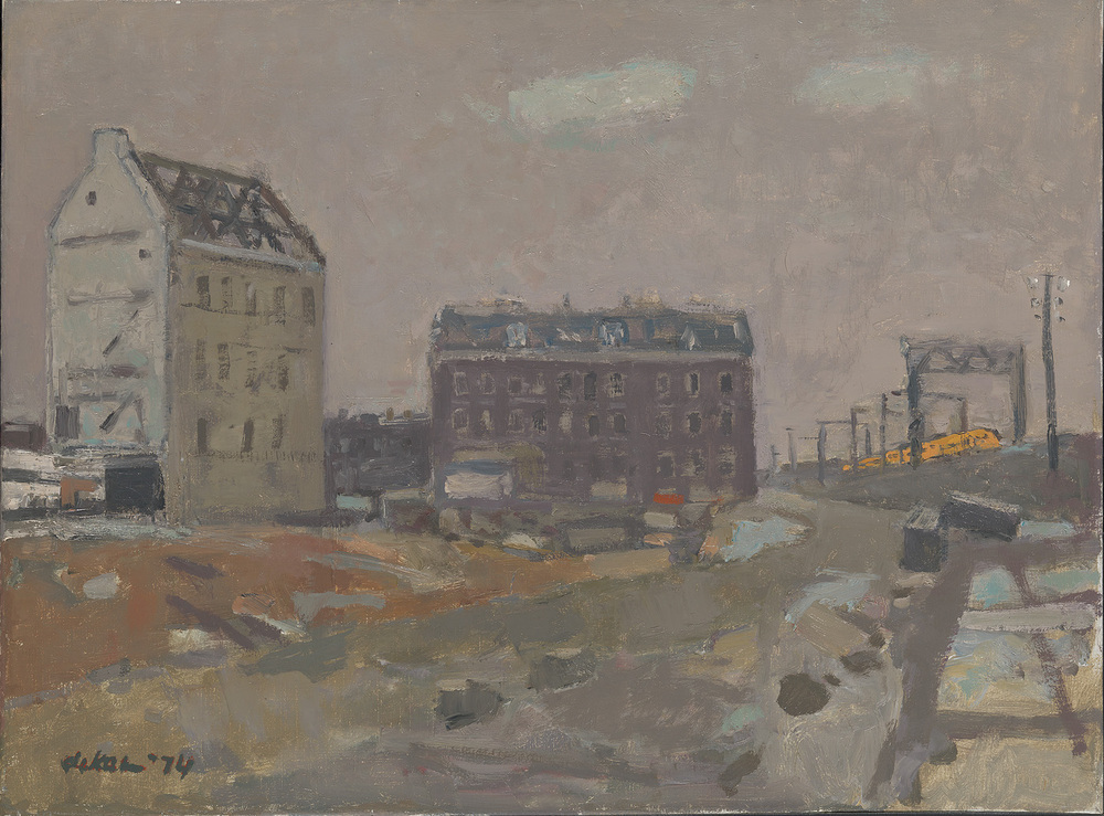 Als de Dordrechtse schilder Otto Boudewijn de Kat (1907-1995) in de jaren zestig naar Amsterdam verhuist, is hij getuige van een stad in de maak. Rond 1970 wordt begonnen met grootschalige stadsvernieuwing. Ook de Haarlemmer Houttuinen, een vervallen volksbuurtje vlak naast de spoorlijn naar Haarlem en Zaandam, moet plaats maken voor een brede autoweg. De Kat, die destijds hoogleraar aan de Amsterdamse Rijksakademie voor Beeldende Kunst is, legt de gesloopte Houttuinen in 1974 vast. Het resultaat is een verstild werk dat qua kleurgebruik enigszins doet denken aan zijn grote voorganger G.H. Breitner. In de voorgrond staan nog twee woonblokken overeind, in de verte raast een trein over het verhoogde spoor. Omdat de autoweg door verzet van buurtbewoners uiteindelijk slechts twee banen, in plaats van de geplande vier, krijgt, blijft er toch ruimte voor nieuwbouw over. Tien jaar na de sloop worden nieuwe woonblokken tussen het Haarlemmerplein en de Korte Prinsengracht opgeleverd, die er tegenwoordig nog steeds staan. ( Sarah Remmerts de Vries)