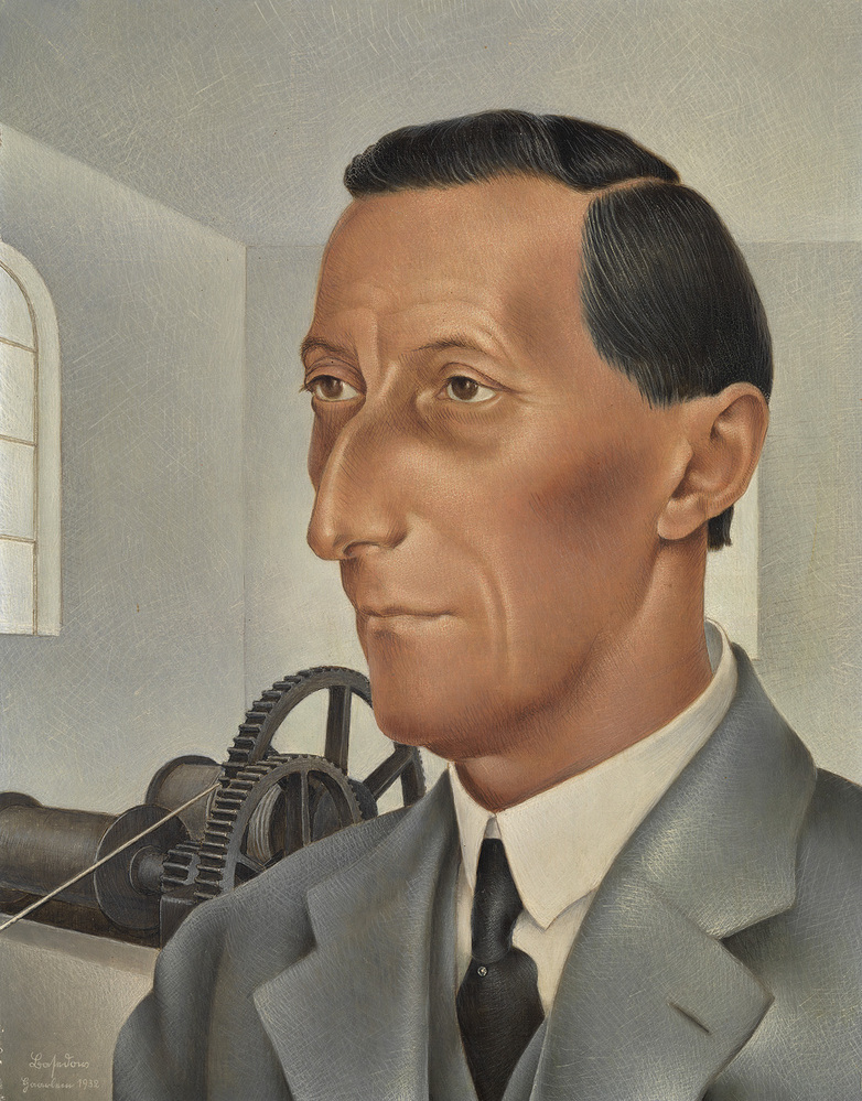Ad Grimmon (1883-1953) was interieurarchitect voor de Gemeente Amsterdam. Hij ontwierp veel interieurs voor publieke gebouwen, zoals de Trouwkamer van het stadhuis, maar richtte ook tentoonstellingen en winkels in, voor bijvoorbeeld Hirsch en Metz. Zijn stijl ontwikkelde zich met de tijd mee vanuit de ambachtelijke traditie van de Amsterdamse School naar industrieel modernisme. Dit intrigerende portret in stijl van de Nieuwe Zakelijkheid is gesigneerd door ‘Lafadons Gaarlem’. Dit is waarschijnlijk een psuedoniem voor meubelmaker Geer de la Mar (1886-1974) uit Haarlem. Grimmon ontwierp voor zijn nicht Fien de la Mar het interieur van het DeLaMar theater. ( Sarah Remmerts de Vries)