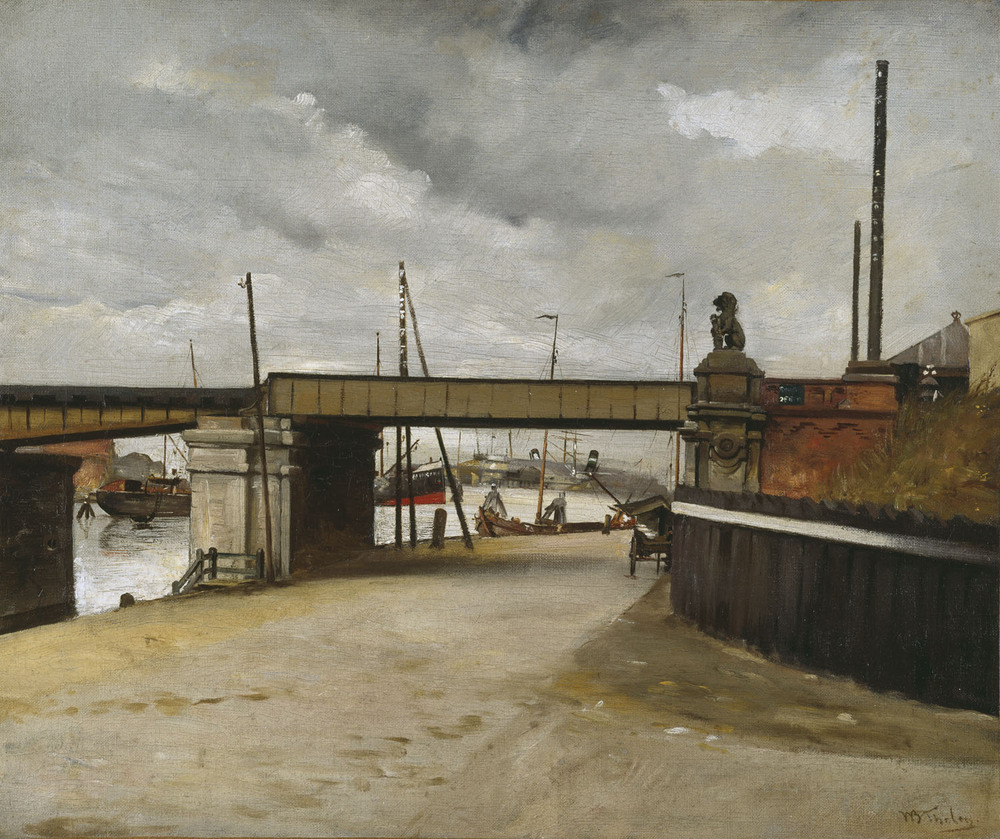 Onder het viaduct door kijkt men op het Westerdok, langs de kade ligt een houten scheepje afgemeerd. Tholen zeilde met een soortgelijk schip vooral op de Zuiderzee, vermoedelijk deed hij op zijn tochten ook Amsterdam aan. De zuurkraam, die rechtsonder het viaduct te zien is, werd beschreven door Theo Thijssen in "Jongens dagen" (p. 82 en 85) en afgebeeld door Jan Sluyters (p. 81). Jacob Olie heeft het viaduct ook gefotografeerd, maar van de andere kant (zie: Jacob Olie, Amsterdam gefotografeerd, 1973, afb. 162).