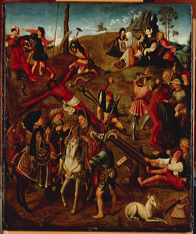 Verschillende scènes uit het lijdensverhaal zijn afgebeeld. Linksboven in de voorstelling wordt Christus bespot, rechts wordt hij gegeseld en met doornen gekroond. Op de achtergrond zijn Maria en Johannes te zien, terwijl de Heilige Veronica de zweetdoek met de afdruk van Christus’ gelaat ophoudt. In het midden wordt Christus door beulen aan het Kruis genageld. De drie rijkgeklede figuren op de voorgrond houden zich afzijdig van de gruwelen. Het zijn misschien portretten van de opdrachtgevers. ( Norbert Middelkoop)