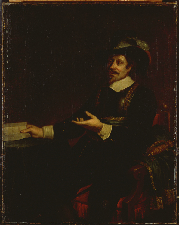 Zittende man met snor, baard, bepluimde hoed en borstharnas. In zijn linkerhand, die op de tafel rust, houdt hij een beschreven stuk papier.