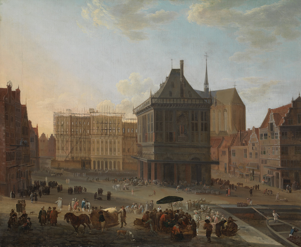 Vanaf de oostzijde van de Dam zien we uit over het drukbevolkte plein. Het nieuwe stadhuis is nog in aanbouw. Bij de Waag laten handelaren hun waren wegen. Op de voorgrond worden groente en vis verkocht.
