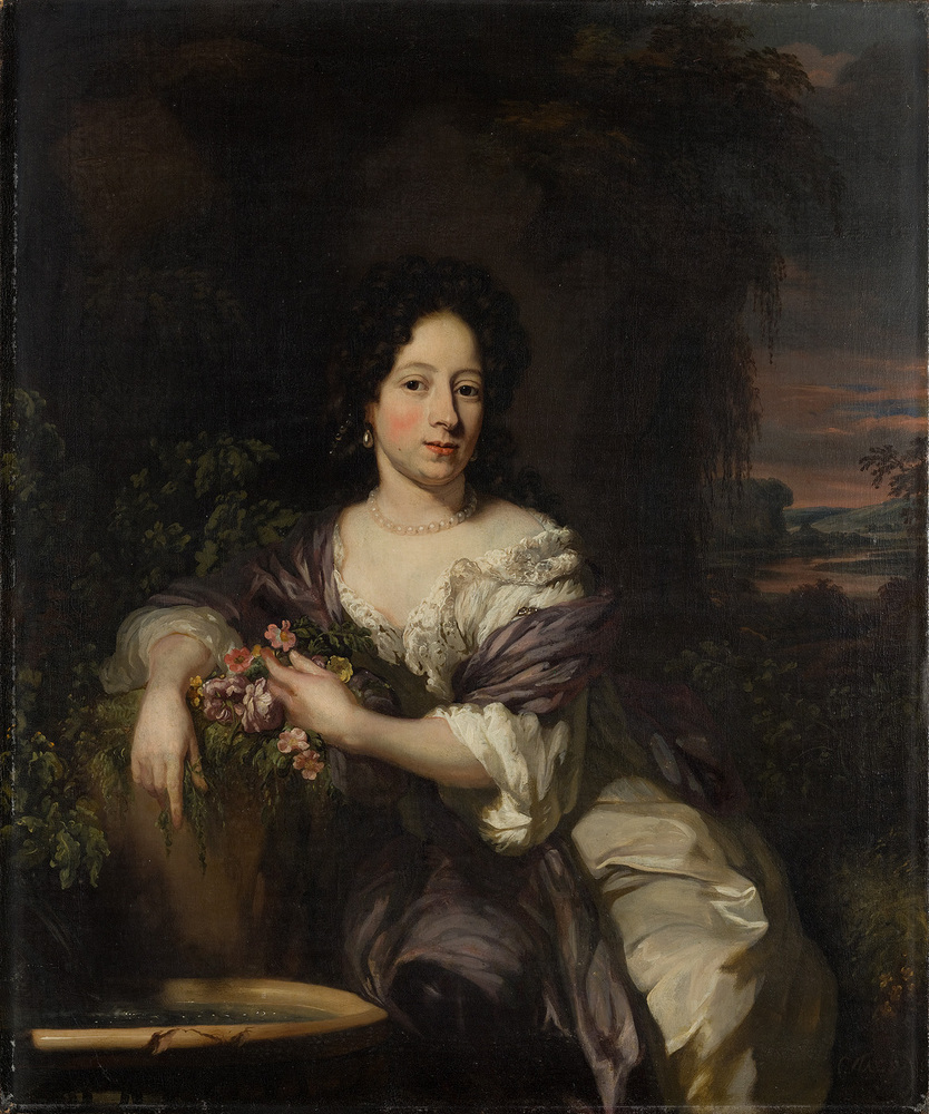 Tegenhanger van het voorgaande nr. Magdalena de la Court (Leiden 1662 Huize Voortwijck 1712), dochter van Pieter de la Court en Catharina van der Voort, huwde op 7 juli 1682 met Mr. Willem Backer (ELIAS I, blz. 508). Cat.nrs. 258 en 259 zijn dus in of na 1682 ontstaan. Ook de stijl van en de costuums op beide stukken wijzen erop dat zij tot Maes' zeer late werken behoren. ( Albert Blankert)