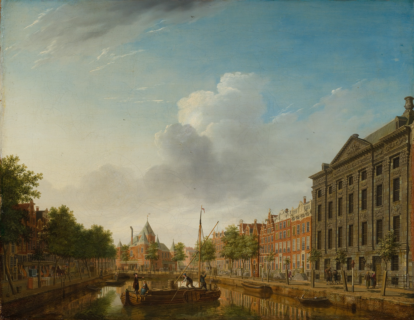 Behalve aan de grachtengordel woonde de vooraanstaande burgerij ook in andere delen van de stad, zoals hier aan de Kloveniersburgwal. Rechts is afgebeeld het Trippenhuis, tussen 1660 en 1664 gebouwd door de architect Justus Vingboons voor de gebroeders Trip. Achter de gevel gaan twee huizen schuil.
