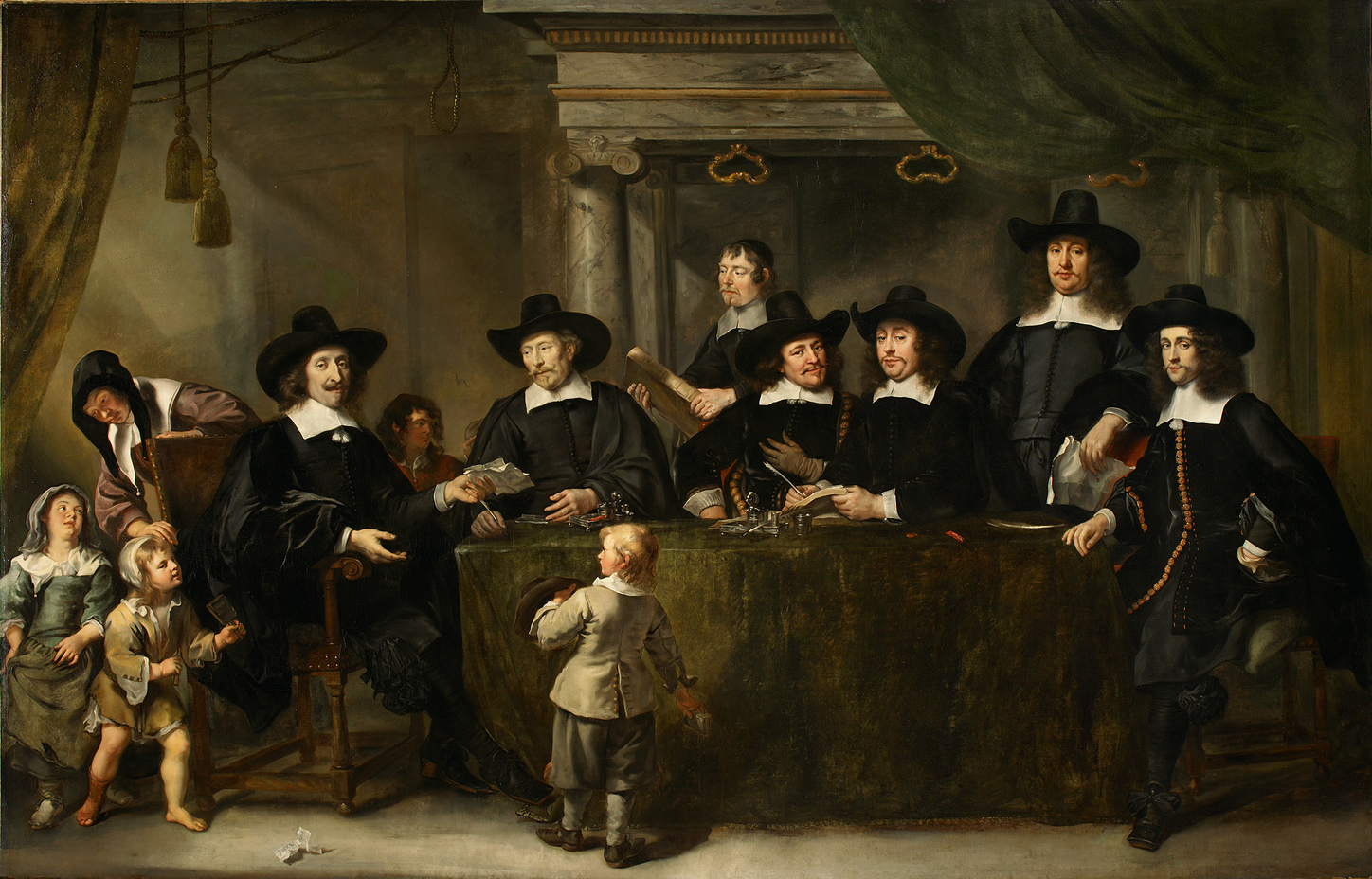 Het is onduidelijk wat de rol van het jongetje op de voorgrond is. Mogelijk wordt hij ingeschreven, evenals de jongen en het meisje links. De notaris-boekhouder assisteert de regenten bij de administratie. Vijf van de zes regenten op dit schilderij behoorden tot het college dat in 1656 het plafond liet beschilderen. ( Norbert Middelkoop)