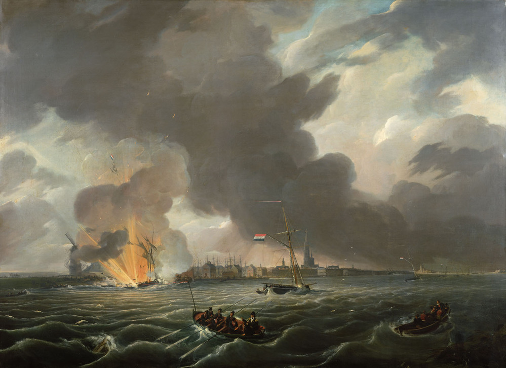 Het schip explodeert nadat luitenant ter zee J.C.J. van Speyk de lont, of een sigaar, in het kruitvat heeft gestoken. De Nederlandse driekleur schiet als een pijl de hemel in. Het grootste deel van de bemanning kwam om het leven. Het Burgerweeshuis kocht het schilderij in 1832. Bezoekers konden het voor 25 cent in het weeshuis bekijken.