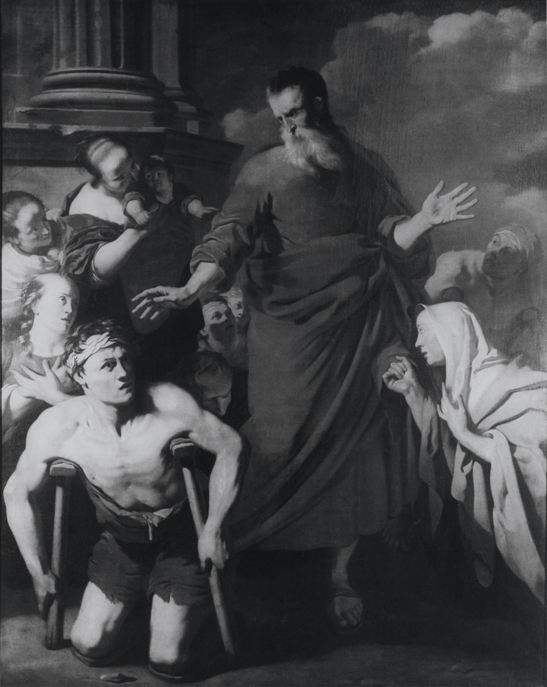 Hofstede de Groot noemde de voorstelling van cat.nr. 122 "Petrus geneest de lamme". Hoogewerff en Brochhagen wezen erop dat de man met de lange baard veel waarschijnlijker Paulus is en dat diens genezing van zieken te Lystra is afgebeeld (Hand. 14, 8-10). ( Albert Blankert)