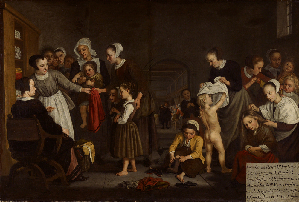 Op 15 december 1657 werd het Diaconieweeshuis in gebruik genomen, speciaal bestemd voor weeskinderen, waarvan de ouders geen poorters waren doch wel van Hervormde huize. In het monumentale gebouw op het eiland Vlooyenburgh aan de Amstel konden zij naast onderdak rekenen op onderwijs en medische zorg. Enkele jaren na de inwijding van het gebouw vervaardigde Jan Victors twee schilderijen voor de diaconessenkamer. De doeken zijn door de opschriften in de hoeken verbonden met de zittingsperiode van twaalf diaconessen tussen juni 1659 en juni 1660. De opdracht aan de schilder zal van hen afkomstig zijn geweest maar zelf schitteren de dames door afwezigheid. Hun keus viel namelijk niet op een portret van een vergaderende groep, die goed bestuur of barmhartigheid aan de dag legt, maar op twee scènes waarin de dagelijkse zorg in het tehuis centraal staat. Geloofsoverwegingen zullen hierbij doorslaggevend zijn geweest. Ook in het oeuvre van de godvruchtige Victors nemen de doeken een uitzonderlijke plaats in. Hij is bekend om zijn bijbelse voorstellingen en sobere portretten, die iedere vorm van pronkzucht ontberen. Daarnaast schilderde hij kleinfigurige dorpstaferelen, waarin thema’s als vergankelijkheid, lijden en bedrog centraal staan [SA 8341-8342].
