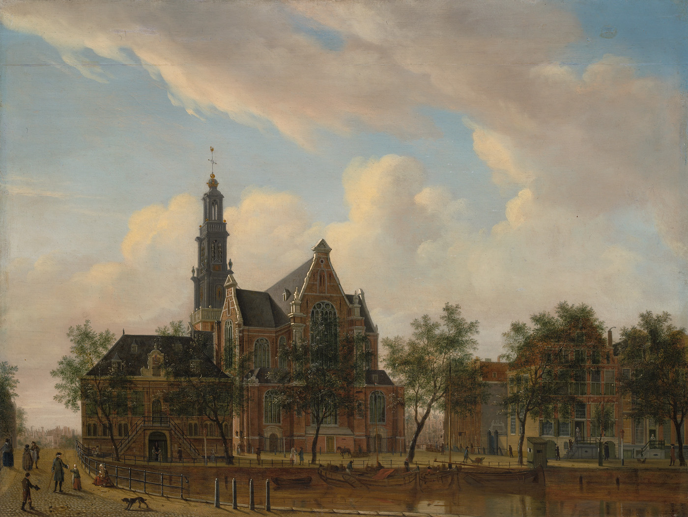 De Westerkerk met ervóór de Westerhal, gezien vanaf de overzijde van de Keizersgracht. Links een brug over de gracht. Er lopen enkele figuren op. Rechts drie schuiten en een sloep aan de kade.