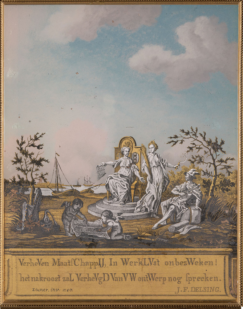 De Maatschappij of het Genootschap, een kenmerkend verschijnsel van de Verlichting, wordt in deze allegorie voorgesteld als een vrouw; met de wapens van Holland, Haarlem en Amsterdam. Zij toont het ‘programma’ aan Ceres, godin van de landbouw en Mercurius, god van de handel en nijverheid. In 1778 werd een belangrijke afdeling van dit genootschap opgericht met als doel bevordering van landbouw, handel en nijverheid, de ‘Economische Tak’.