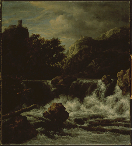 Berglandschap met waterval, 1660 - 1665 doek, olieverf hoogte: 111 cm; breedte: 99 cm; hoogte lijst: 131.6 cm; breedte lijst: 119.5 cm; dikte lijst: 11.7 cm; signatuur rechtsonder: JRuisdael