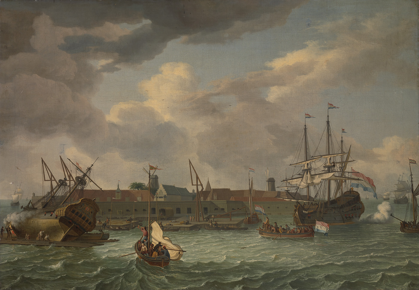 Gezicht op een scheepswerf. Links wordt een gekrengd schip opgekalefaterd. Rechts vuurt een schip een salvo, op het water enkele sloepen, één voert een vlag met monogram. Achter de gebouwen staan enkele molens en palmen.Op het schilderij zijn kanonnen zichtbaar en op de kade staan hijskranen.