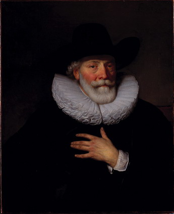 Man met baard, zwarte hoed met brede rand. Geplooide witte kraag, linkerhand voor de borst houdend.