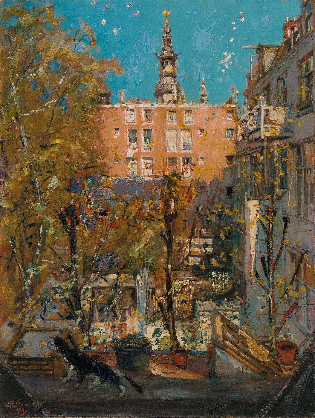 Vanuit het raam van zijn atelier aan de Lutmastraat schildert Monnickendam op een zonnige voorjaarsdag de achtergevels van de huizen aan de Amsteldijk en de Tolstraat. We zien de torenspits van het Gemeentearchief en bloesembladeren dwarrelen door de lucht. Na zijn eindexamen aan de Rijksacademie volgt Monnickendam lessen aan de Parijse École des Arts et Metiers. Daar ontwikkelt hij zijn schilderstijl die soms impressionistisch aan doet, altijd kleurrijk en met dikke lagen verf aangebracht. ( Anneke van de Kieft)