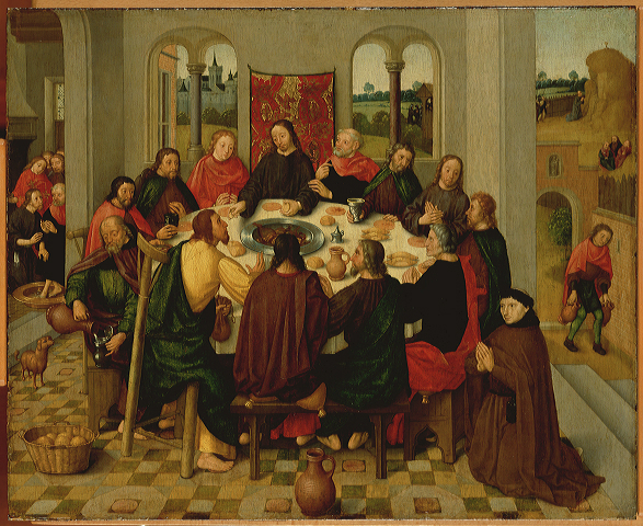 Gezeten aan het Paasmaal, deelt Christus brood en wijn uit aan zijn apostelen, nadat hij er de zegen over heeft uitgesproken. Afgebeeld is het moment waarop Christus laat zien door wie hij zal worden verraden. Degene die het brood ontvangt, is Judas, herkenbaar aan de geldbuidel. Er zijn nog twee scènes afgebeeld. In het vertrek links wast Christus nederig de voeten van zijn leerlingen. Rechts op de achtergrond is hij in gebed in de Hof van Gethsemane, terwijl de drie apostelen slapen. Onder aanvoering van Judas naderen Romeinse wachters om hem te arresteren. In de rechter benedenhoek knielt een monnik in gebed. Ongetwijfeld is hij de opdrachtgever voor het schilderij. Mogelijk heeft dit Laatste Avondmaal, samen met het schilderij De Opstanding van Christus hiernaast, deel uitgemaakt van een altaarstuk in een Amsterdams klooster. ( Norbert Middelkoop)
