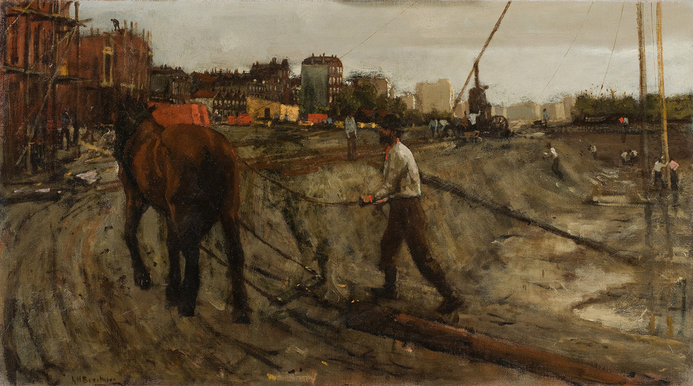 Amsterdam breidde omstreeks 1900 razendsnel uit. Rondom de oude stad verrezen nieuwe woonwijken, rustend op miljoenen palen. De schilder George Hendrik Breitner was gefascineerd door de moderne stad en legde de bouwwerkzaamheden vele malen vast. Hier zijn we waarschijnlijk in de buurt van de Overtoom. Een paard sleept een heipaal naar de bouwput. Rechts wordt een andere paal de grond in geslagen met een stoomheimachine. ( Laura van Hasselt)