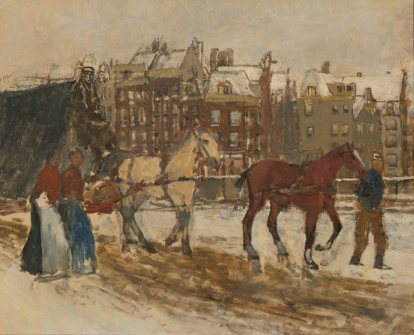 Dit schilderij stond onvoltooid op de ezel toen Breitner overleed. Het is het door de schilder zo geliefde uitzicht op het Rokin vanuit de sociëteit Arti & Amicitiae. Op straat ligt sneeuw. In de voorgrond lopen twee vrouwen het beeld in en begeleidt een man paarden die een kar voortrekken. Paarden behoorden tot Breitners favoriete onderwerpen, vooral trampaarden schilderde hij graag. Tussen de twee huizenblokken aan de overkant van het water is de Langebrugsteeg zichtbaar. Deze verbindt het Rokin met de Grimburgwal. ( Sarah Remmerts de Vries)