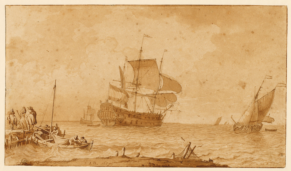 Veiling Saportas 1836, p. 44, Kunstboek N, nr. 1: 'Eene Zee bij kalm weder, ter zijde een havenhoofd, rijk gestoffeerd met onderscheidene zeilende vaatuigen, fraai met roet, door L. Bakhuysen.' (f 69,- ,aan Smith); (?) Veiling Verstolk van Soelen 1847, p. 38, nr 219: ' Du Même (Ludolf Bakhuysen). Ce pendant du dessin précédent (cat. nr. 9) et lavé de même au bistre, représente une eau agitée, avec un vaisseau de guerre à la voile et autres bâtiments. Il a également beaucoup de mérite.' (f 460,- , aan Brondgeest); Collectie C.J. Fodor, legaat 1860