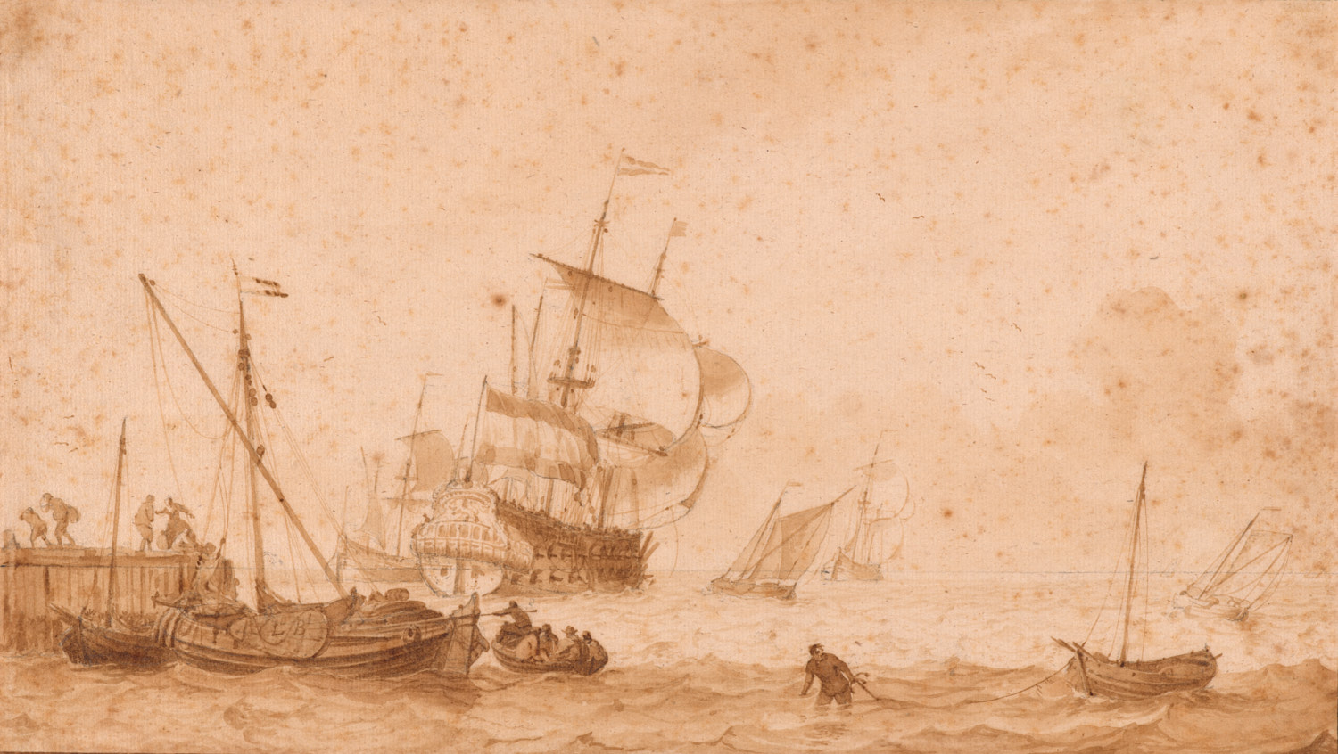 Veiling Mendes de Léon 1834, p. 7, Kunstboek C, nr 9: ' L. Bakhuizen. Een woelend Water; in het midden van hetzelve een oorlogsschip in volle zeilen en een aantal andere schepen; op den voorgrond een kaag en andere vaartuigen aan een havenhoofd; natuurlijk van toon en behandeling, met bruine inkt.' (f 320,- ,aan Engelberts / Lelie); Collectie C.J. Fodor, legaat 1860