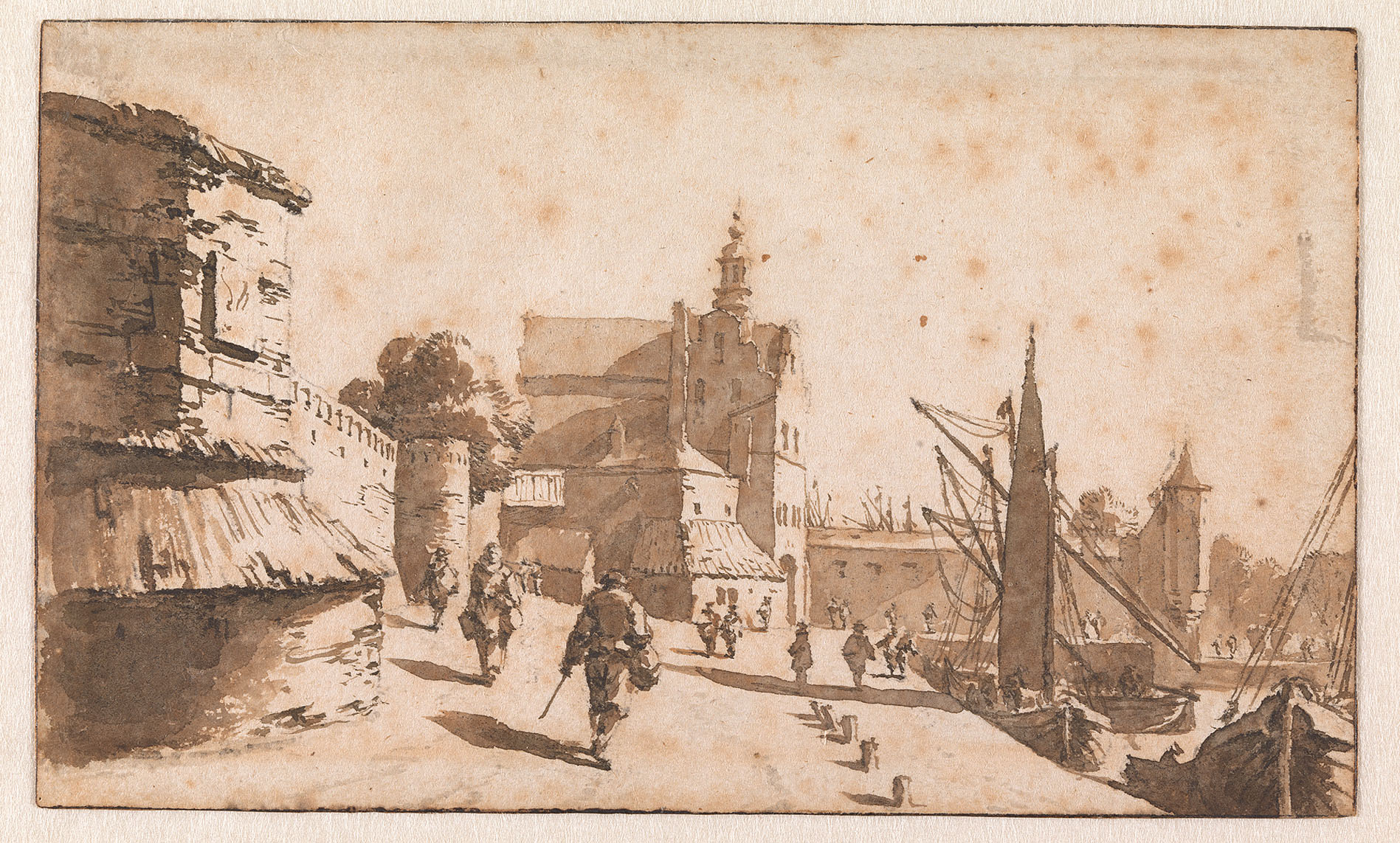 Collectie V. Röver (1686-1739); Veiling Goll van Franckenstein 1833, p. 70, nr. 16: 'Drie stuks gezigtjes op Leyden. Als voren, door denzelven (dun met bruine inkt, door Jan de Bisschop)' (f 25,- ,aan Engelberts); Veiling Goll van Franckenstein 1833, p. 118, nr. 9: ' J. de Bisschop. Een Stads-walmuur met onderscheidene gebouwen, schepen en beeldjes. Uitmuntend fraai met de pen in o.i. inkt' (f 30,- , aan Hulswit); (?) Veiling van Cranenburgh 1858, p. portefeuille B, nr. 50: 'J. de Bisschop. Vue de long des remparts d'une ville; lavé à l'encre de chine' (f 25,- , aan Lamme); Collectie C.J. Fodor, legaat 1860