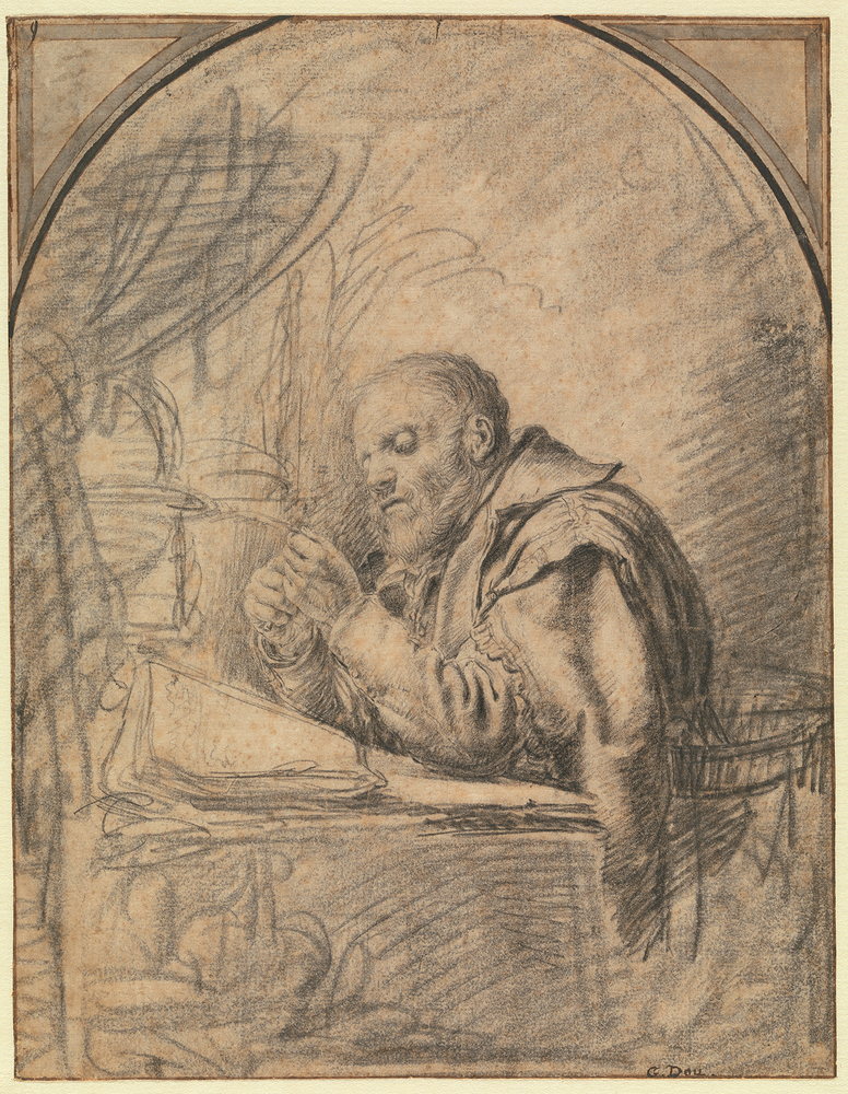 Collectie G. Hoet, verkocht in 1742 aan S. Feitama; Veiling Feitama 1758, p . 1, Letter A, nr. 6: 'Gerard Douw. Een Pennesnydertje; met zwart kryt, zonder jaartal; h. 9¼ br. 7 d.' (f 100,:-:-, aan Yver); Veiling Gildemeester 1800, p. 112, Konst-boek N. nr 1: 'Een bedaagd Man in aloude kleding, zittende voor een Tafel, waarop een Lessenaar geplaatst is, schynende met veel aandagt een Pen te versnyden: het character is zeer natuurlyk, en is allerkonstigst met zwart kryt geteekend; door G. Dou' (f 120,- ,aan Goll); Veiling Goll van Franckenstein 1833, p. 37, Kunstboek I, nr. 1: 'Gerard Dou. Een bedaagd Man in aloude kleding, zittende voor een schrijflessenaar, bezig zijnde eene schrijfpen te vermaken. Breed en meesterlijk met zwart krijt. (f 750.- ,aan Brondgeest); Veiling Verstolk van Soelen 1847, p. 27, Livre E, nr. 159: 'Gérard Dou. Le tailleur de plumes. Ce chef d'oeuvre de l'art, unique par son mérite et sa rareté, représentante un homme âgé, la tête découverte et assis dans un fauteuil devant une table, sur laquelle se trouve un livre ; il est occupé à tailler une plume, et semble y prêter toute son attention. L'exécution soignée au plus haut degré de G. Dou, jointe à la solidité et à la vigueur de Rembrandt, se trouvent réunis dans ce magnifique dessin, exécuté à la pierre d'Italie, et qui peut être considéré comme unique' (901, :- :-, aan Brondgeest voor Fodor, Blanc 1857-1858, dl. 2, p. 466: 'Gerard Dow. Le Tailleur de plumes : c'est un homme âgé, assis dans un fauteuil devant une table, sur laquelle se trouve un livre. A la pierre d'Italie, 901,- fl. Fodor'(zie ook : Maandelijksch 1847, p. 94); Collectie C.J. Fodor, legaat 1860