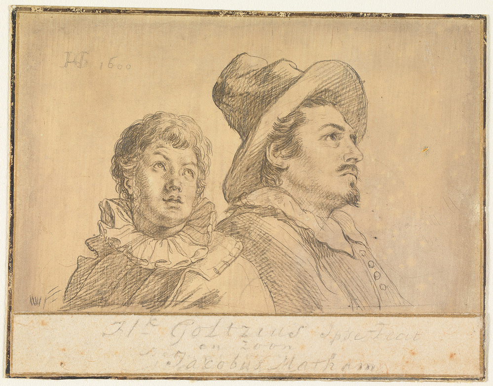 C. Ploos van Amstel Jac. Cornelisz., veiling Amsterdam (Ph. van der Schley, J. de Bosch Jeronz., Bern. de Bosch Jeronz., J. Yver en C.S. Roos) 3 maart 1800 e.v.d., misschien Kunstboek UU, 44: 'Twee mans Pourtraiten, Revers: een Studie van twee beelden; op dito (i.e. tablet), door denzelven.' (i.e. Goltzius; Fl. 18,10 aan Hendricks); Jacob de Vos, veiling Amsterdam (J. de Vries, A. Brondgeest, E.M. Engelberts, C. F. Roos) 30 okt. 1833 e.v.d., Kunstboek XX, nr. 5: 'Portret van Goltzius en zijn zoon J. Matham, Als voren (i.e tablet), door Goltzius.'; J.G. Verstolk van Soelen, veiling Amsterdam (J. de Vries, A. Brondgeest en C.F. Roos) 22 maart 1847 e.v.d., Livre K., nr. 365: ' Son propre portrait et celuit de son gendre.' (Fl. 37,75 aan Brondgeest); Legaat C.J. Fodor, 1860