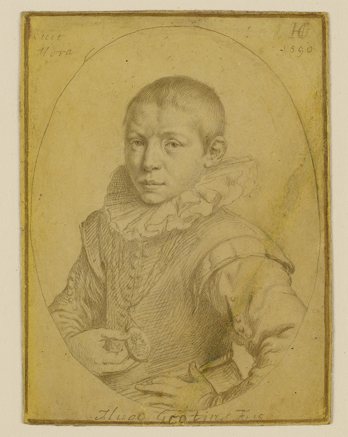 opschrift verso: Dit Pourtret / van Hugo Grotius, oud 15 jaar / is door Hend Goltzius / 1590, naar Leeven / getekend. / ´t Pourtrait van / Koning Hend. de 4de / heeft de groot in / zijn Rechterhand / Jaques de Ghein / heeft het vervolgens / in Koper gesneden